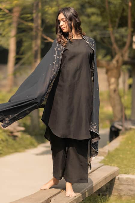 Black linen kurta with high low hem. Paired with straight pant and woven dupatta.