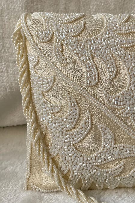 White envelope clutch featuring bead and cutdana embellishment in an abstract pattern