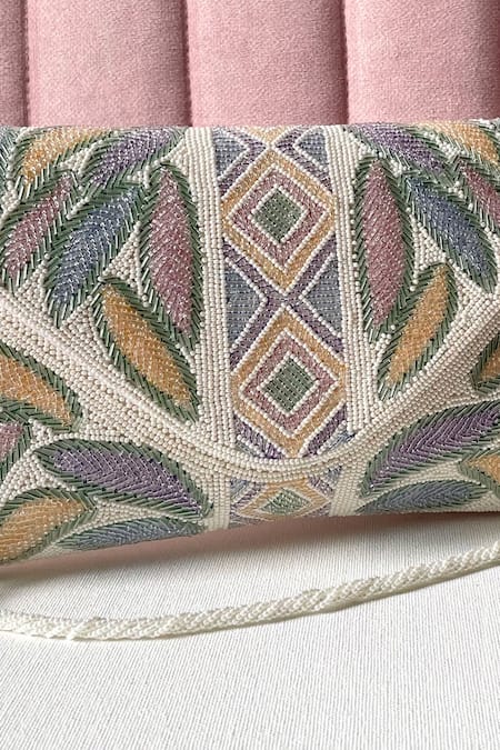 White floral and geometric pattern beaded and cutdana embellished envelope bag