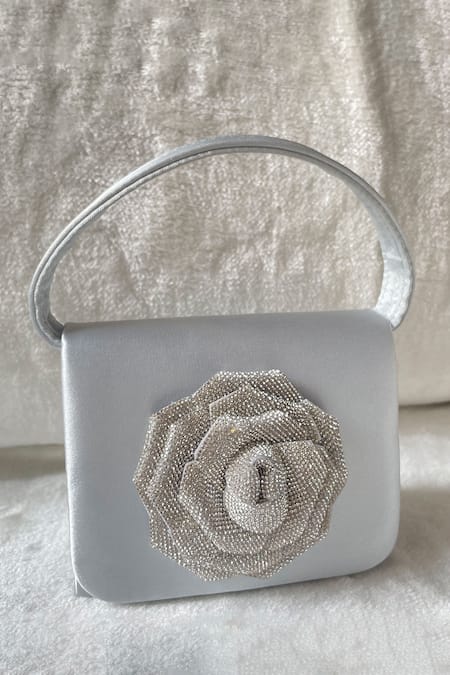 Silver mini bucket bag featuring a center stone embellished flower. Handcrafted with satin material and designed with dimensions of 10 x 7 cm.