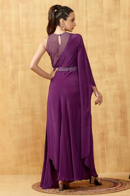 Purple gown featuring an asymmetric silhouette with a round neckline and sequin embellishments. Comes with a matching bustier and belt, featuring a keyhole back and attached lining.