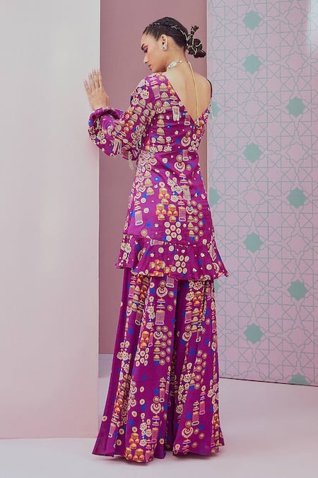 Purple angarakha kurta featuring jhumka patterns with crystal tassels. Paired with matching sharara and pleated frill details.