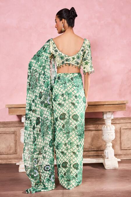Green pre-draped saree featuring floral and checks print with embroidered details. Paired with a floral embroidered padded blouse with a crystal drop detail.