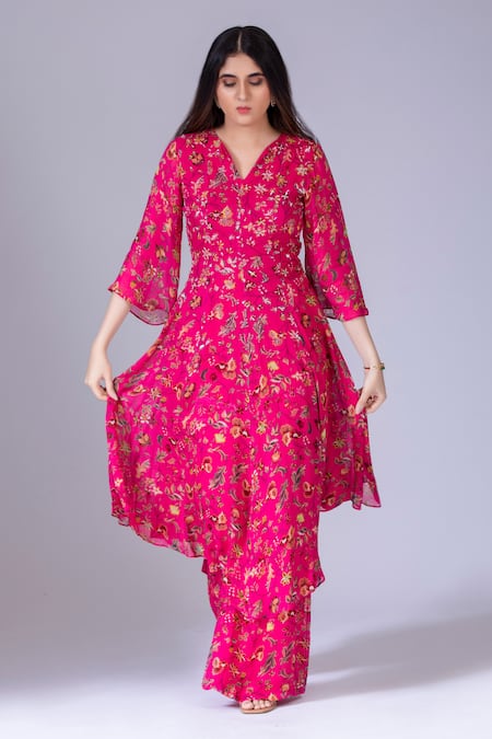 Fuchsia pink anarkali featuring a floral print with sequin and cutdana embroidered yoke. Paired with flared pant for a complete look.