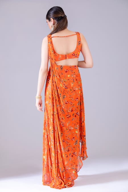Orange dhoti skirt featuring all-over floral print and pleated cowl drapes. Paired with a printed padded blouse adorned with bead, sequin, and cut dana hand work, along with a pleated drape.