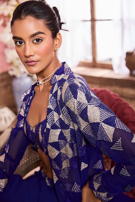 Blue long cape featuring geometric pattern with beads and stones embroidery. Paired with an embroidered padded blouse and a draped skirt with an embroidered waistband.