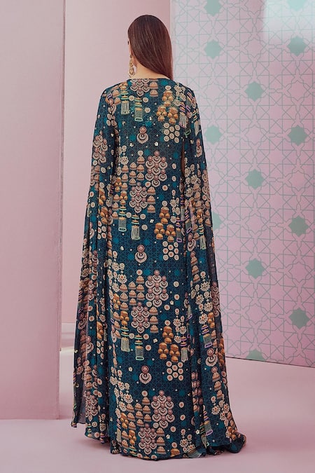 Emerald green crepe blouse featuring sleeveless design and round neckline. Paired with a printed skirt with a center slit and a sequins embroidered cape with slit sleeves.