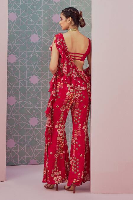 Red georgette ruffled pant saree featuring printed jhumkas and a sequins embroidered blouse. Includes a tasseled hem on the blouse for added detail.