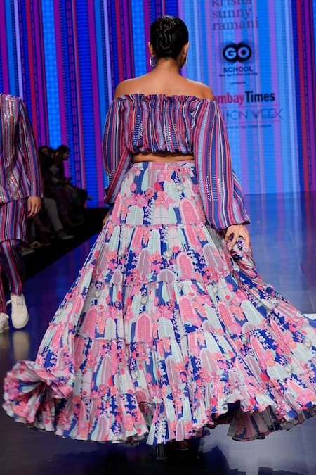 Blue georgette off-shoulder blouse featuring striped print and beaded hand embroidery. Paired with a layered crepe skirt adorned with a vibrant floral print.