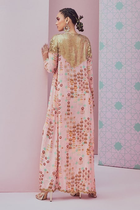 Blush pink cape with jhumka patterns embellished with sequins. Paired with a matching blouse and pleated draped dhoti skirt featuring scalloped borders.