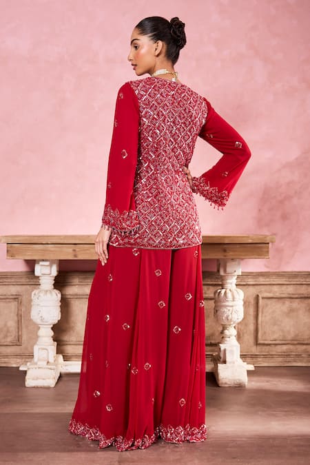 Red kurta featuring V-neck, bell sleeves, and geometric pattern embroidery with crystals, sequins, and beads. Paired with an embroidered sharara for a complete look.