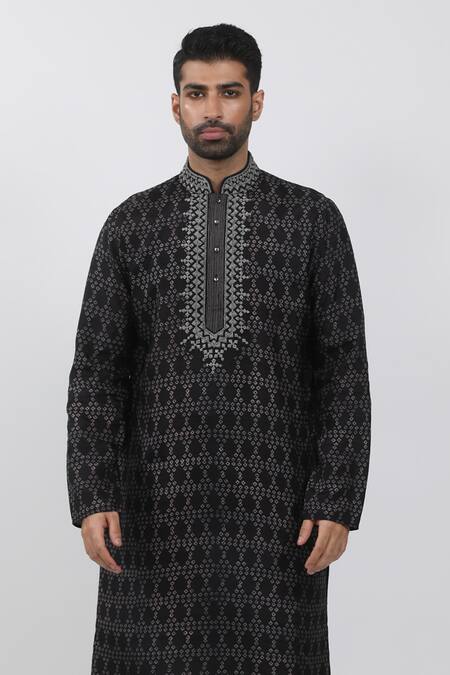 Black kurta featuring bandhani hand block print with bead embroidered placket. Paired with a churidar for a complete look.