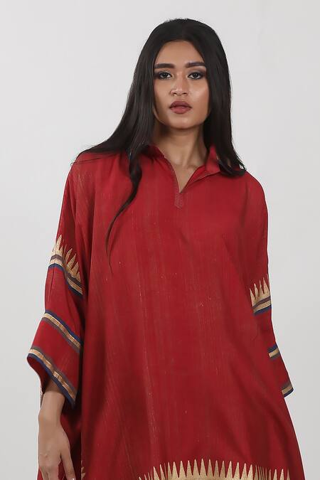 Red block print tunic featuring a shirt collar and asymmetric hem