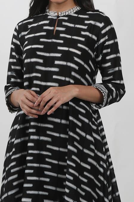 Black shibori tie-dye A-line kurta featuring a round neckline and long sleeves
