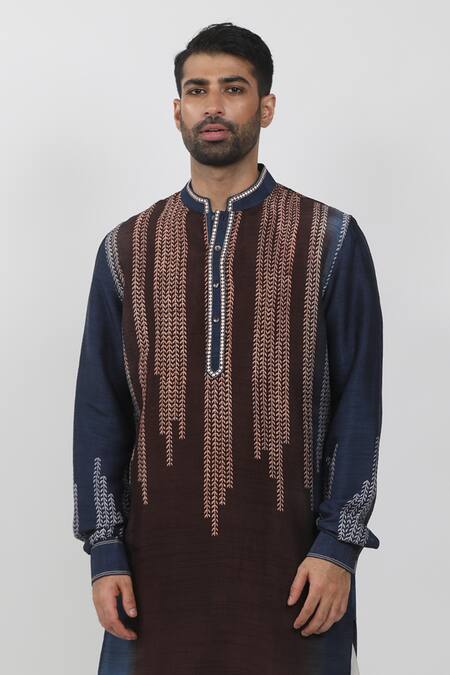 Blue kurta featuring leaf hand block print with stripe pattern and thread embroidered placket