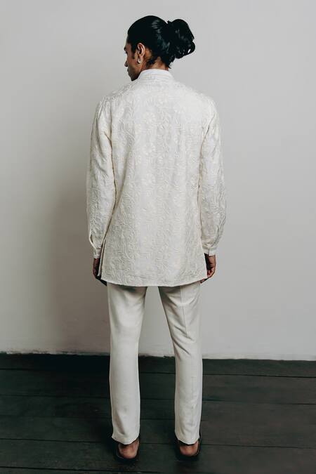 White kurta featuring floral thread embroidery with a band collar and long sleeves