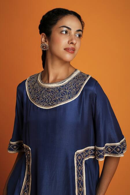 Blue Modal Placement Hand Embroidery Zardozi Round Neck Yoke Tunic
