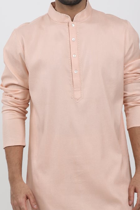 Peach kurta featuring a textured pattern and mandarin collar. Paired with a matching pant for a complete look.