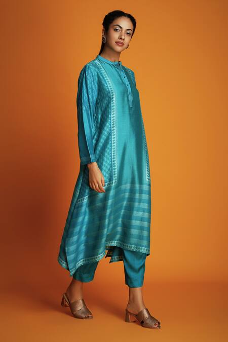 Turquoise ombre kurta featuring geometric hand block print and mandarin collar. Paired with matching narrow pant for a cohesive look.