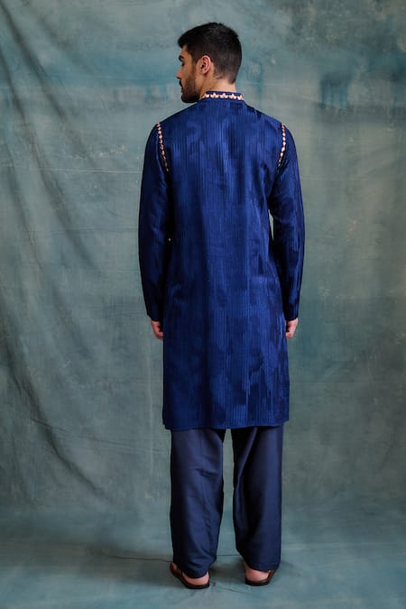 Navy blue kurta featuring tonal resham embroidered abstract patterns and placed floral gota patti motifs on the placket. Paired with matching salwar for a complete look.