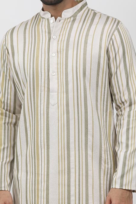 Off-white kurta featuring olive toned stripe textured embroidery with silver accents. Paired with a narrow pant for a cohesive look.