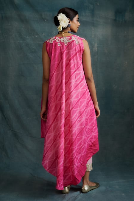 Pink Tussar Embroidery Beads V-neck Tie Dye Asymmetric Flared Tunic
