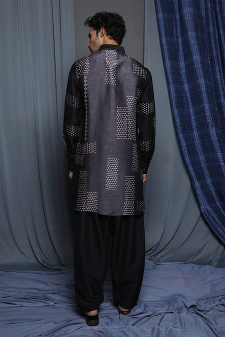 Black Tussar Embroidery Geometric Print Ombre Kurta
