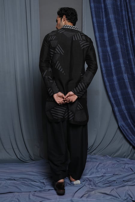 Black kurta featuring a stripe print and an embroidered placket