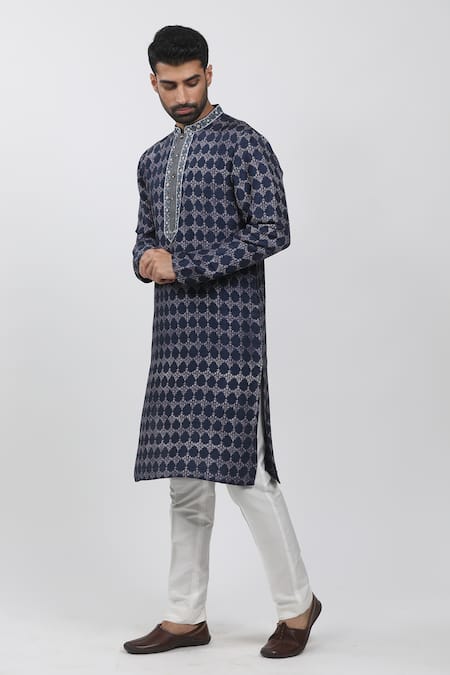 Indigo tussar kurta featuring zardozi embroidered mandarin collar and vintage hand block print. Paired with a white gathered churidar.