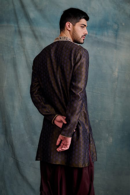 Brown kurta featuring a contrast blue floral butti pattern and intricate zardozi embroidery on the placket. Paired with a dhoti pant for a complete traditional look.