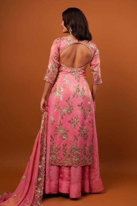 Pink kurta featuring sweetheart neckline and three fourth sleeves with all over Petunia bloom embroidery highlighted by gold toned sequins. Paired with an embellished flared sharara and a cutwork sequin bloom border embroidered dupatta.