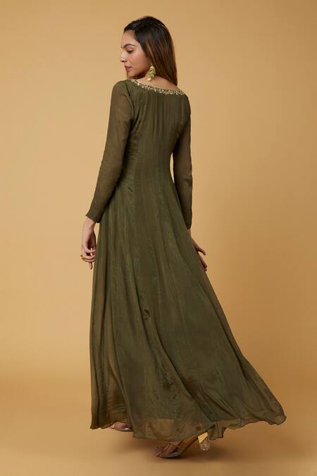 Green Chiffon Embroidery Scoop Neck Zardozi Neckline Anarkali Set