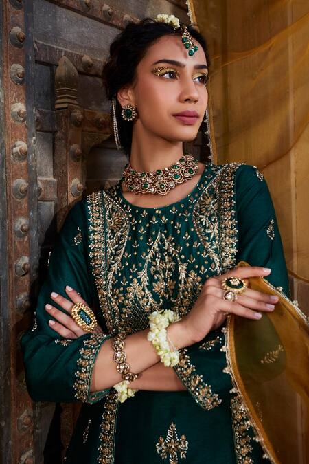 Green silk A-line kurta featuring zardozi and metal work embroidery with cut-out and slit detailing. Paired with a tissue palazzo and mustard yellow organza dupatta.