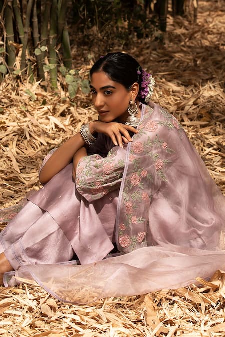 Purple Dupatta Organza Silk, Kurta Chanderi, Pant Embroidered Sleeve Set