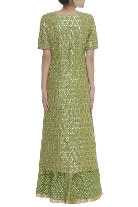 Sparkle around in this heavy embroidered, sage green kurta, beautifully adorned with pearls and thread embroidery. Comes with golden print embellished lehenga and a dupatta.
