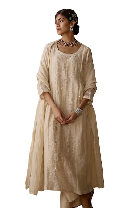 Ivory chanderi kurta featuring hand embroidered floral thread work and sequins. Paired with a matching chanderi dupatta and cotton pant with slip.