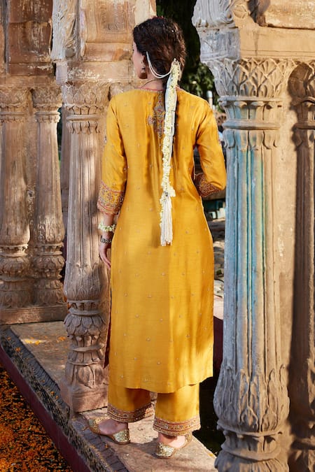 Yellow Silk, Tissue Beads V-neck Floral Embroidered Kurta Pant Set