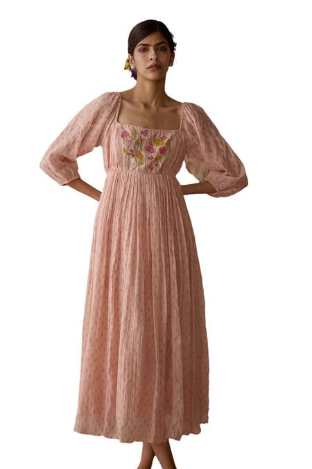 Hand embroidered floral yoke detail, Gathered flared design, Puff sleeves with elastic cuffs