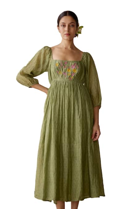 Green Chanderi Embroidery Square Neck Floral Hand Yoke Tunic
