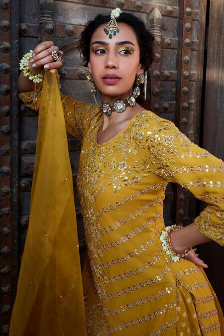 Yellow kurta featuring all-over gota embroidery with a round neckline and three-quarter sleeves. Paired with a tulip pant and an embroidered organza dupatta.