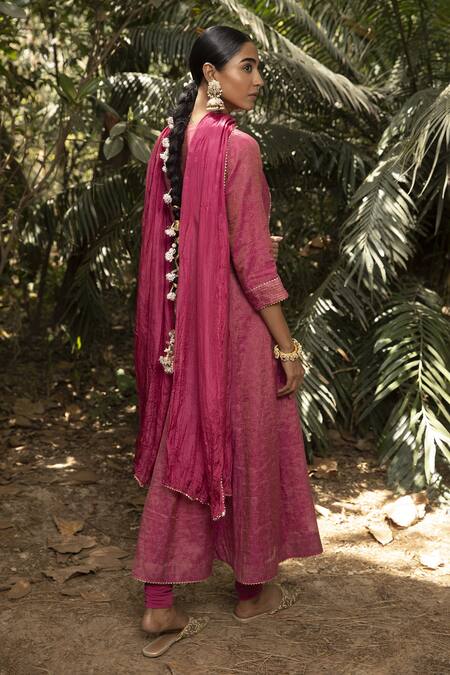 Pink anarkali with hand embroidered yoke. Comes with churidar & crushed silk dupatta.