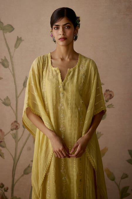 Yellow kaftan featuring batwing sleeves, notched neckline, and hand embroidered floral, thread, and sequins details. Paired with cotton pants that have lace detailing and a slip.