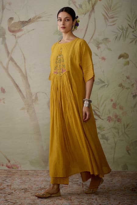 Yellow handwoven gathered tunic in chanderi featuring thread hand embroidered yoke and lace detailing. Paired with cotton pant adorned with lace and block printed polka dots, along with a slip.