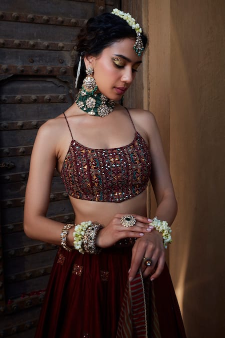 Maroon lehenga featuring thread and mirror placement embroidery. Paired with a backless blouse and a striped dupatta.
