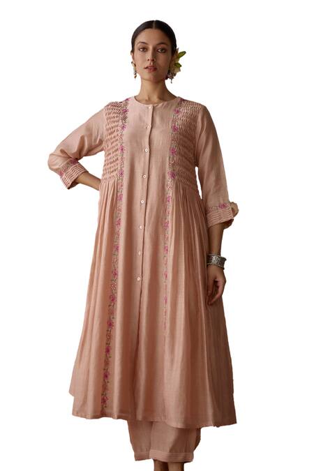 Pink hand embroidered kurta featuring pintucks and side gathers. Paired with a matching chanderi dhoti pant.