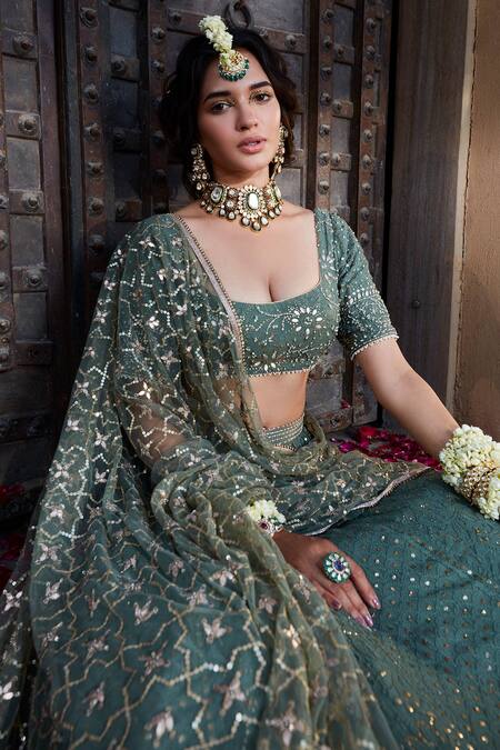 Sage green lehenga featuring mukaish embroidery with scallop and floral patterns. Paired with a gota and pearl embellished blouse and a net dupatta.