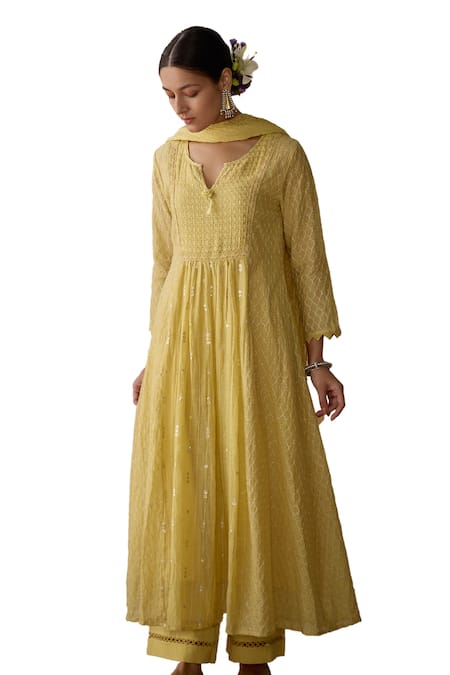 Lemon yellow A-line kurta featuring thread and sequin embroidery in chanderi fabric with front and back gathers. Paired with a crushed chanderi dupatta and cotton pant with lace detailing.