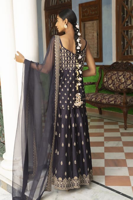 Blue short kurta with floral motif zari embroidery. Paired with embroidered gharara & organza dupatta.