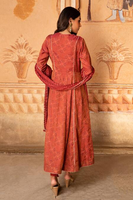 Rust red anarkali in tissue chanderi base fabric with hand embroidered details. Paired with a churidar & crushed silk dupatta.