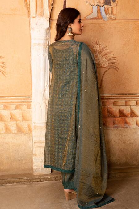 Teal angarkha in tissue chanderi base with hand embroidered details & side tie-up. Paired with pant & dupatta with pearl work.